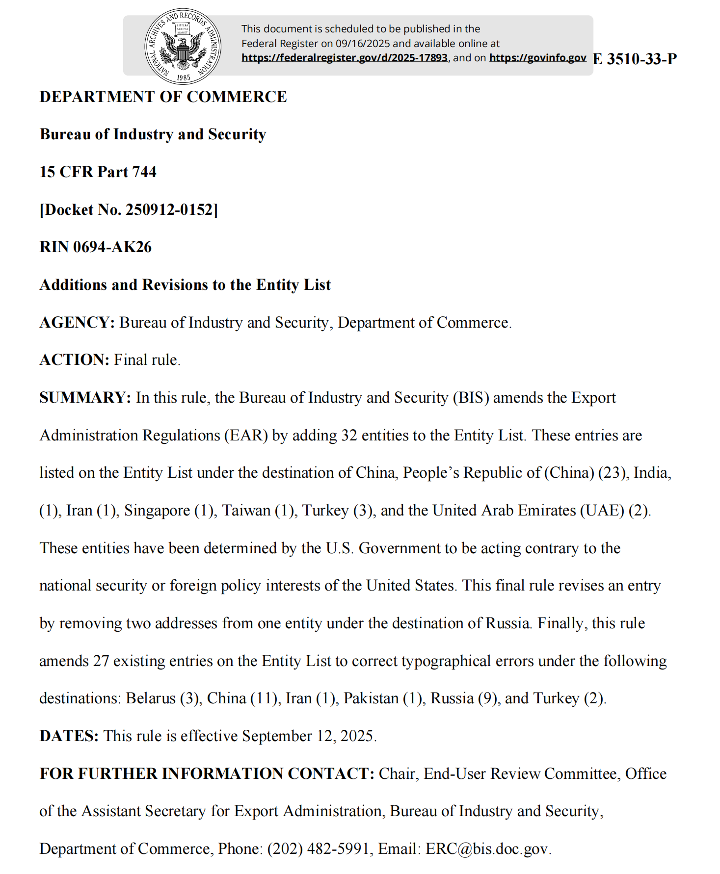 BIS称,这些公司或机构存在"违背美国国家安全或外交政策利益"的行为,包括为中国的先进计算\集成电路制造和分销部门提供支持,以及参与生物技术\工程软件开发\半导体制造设备采购等领域,存在规避出口管制\为受制裁对象转运物项的风险等.